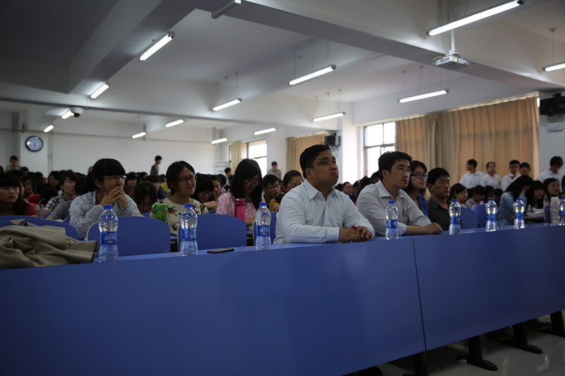随后,一段高亢激昂的诗歌朗诵为系列活动拉开序幕,6名2015届毕业生代表陆续上台做求职演讲,他们流利动听的语言、饱满真挚的感情感染着台下的每一学生,教室里掌声不断。特别是当胡友圣同学出场时,他那富有磁性的嗓音深深打动了每一位在场同学的心,也把开幕式推向了高潮。演讲结束后,专业老师的精彩点评和悉心指导让在场的同学们受益匪浅,同时也为随后的600人求职演讲活动指明了方向。