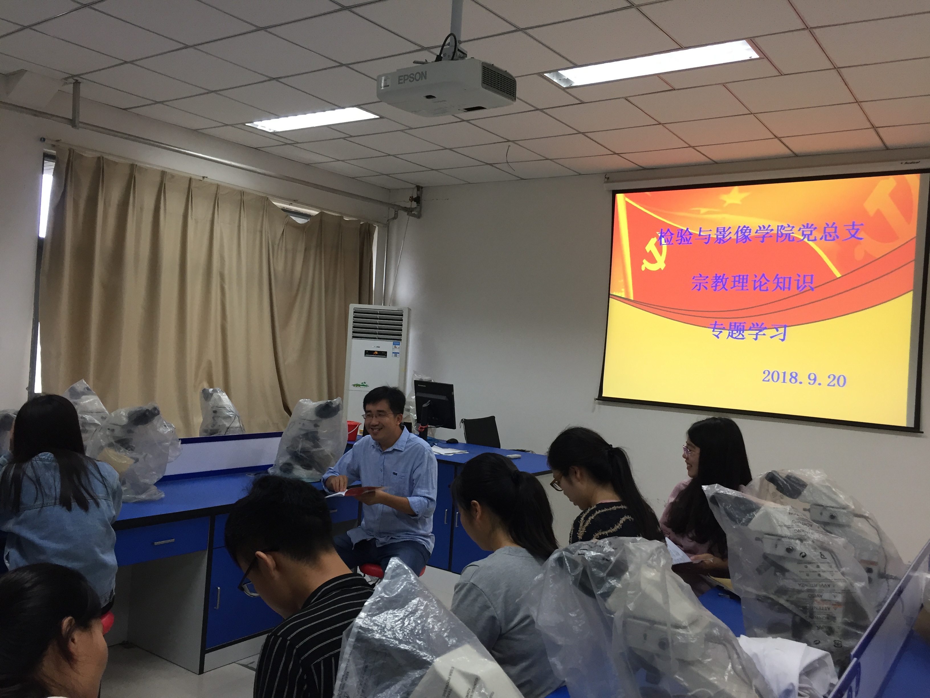 2018年9月20日,检验与影像学院学院党总支在院系楼四楼互动三实验室组织开展检验与影像学院党总支宗教理论知识专题学习的会议,学习高校民族宗教工作知识读本。会议由检验与影像学院副院长胡淼主持,检验与影像学院全体教师参加。