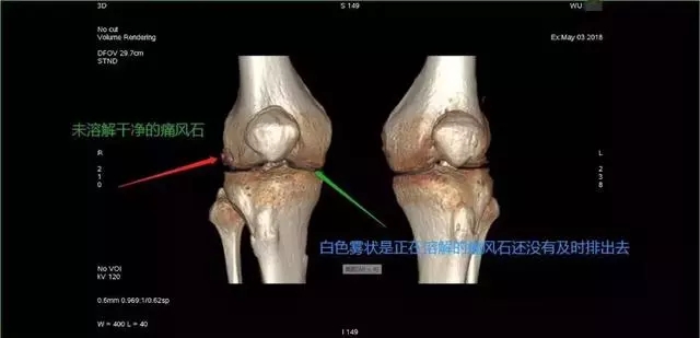 2、右膝盖关节腔白色雾状物为正在溶解未来得及排泄的尿酸盐,也就是积液产生的根源;