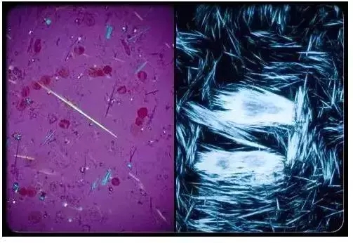 通过对痛风石或关节腔穿刺抽液偏振光检查下是否有表现为负性双折光的针状或杆状的单钠尿酸盐结晶体,尿酸盐晶体在急性发作期可见于关节滑液中白细胞内、外;也可见于在痛风石的抽取物中,在发作间歇期,也可见于受累关节的滑液中。