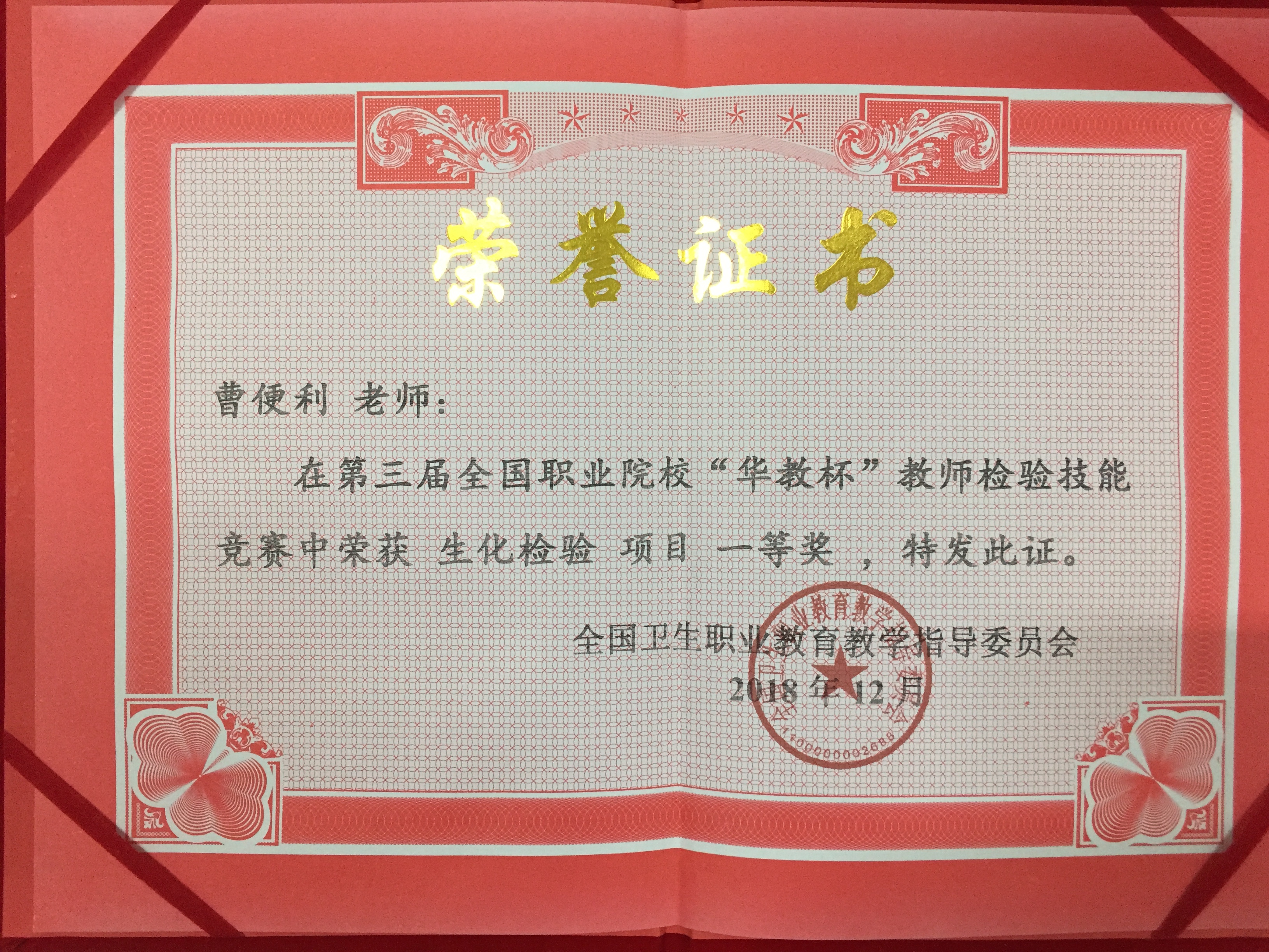 11月29日-12月2日,第三届全国职业院校教师检验技能竞赛在扬州职业大学隆重举行。我校青年教师曹便利在生化检验组套中荣获一等奖,徐佳、王卫芳、常圣雅分别在形态学检验组套、免疫检验组套、血常规检验组套中获得二等奖,孙俊超在微生物检验组套中取得三等奖。