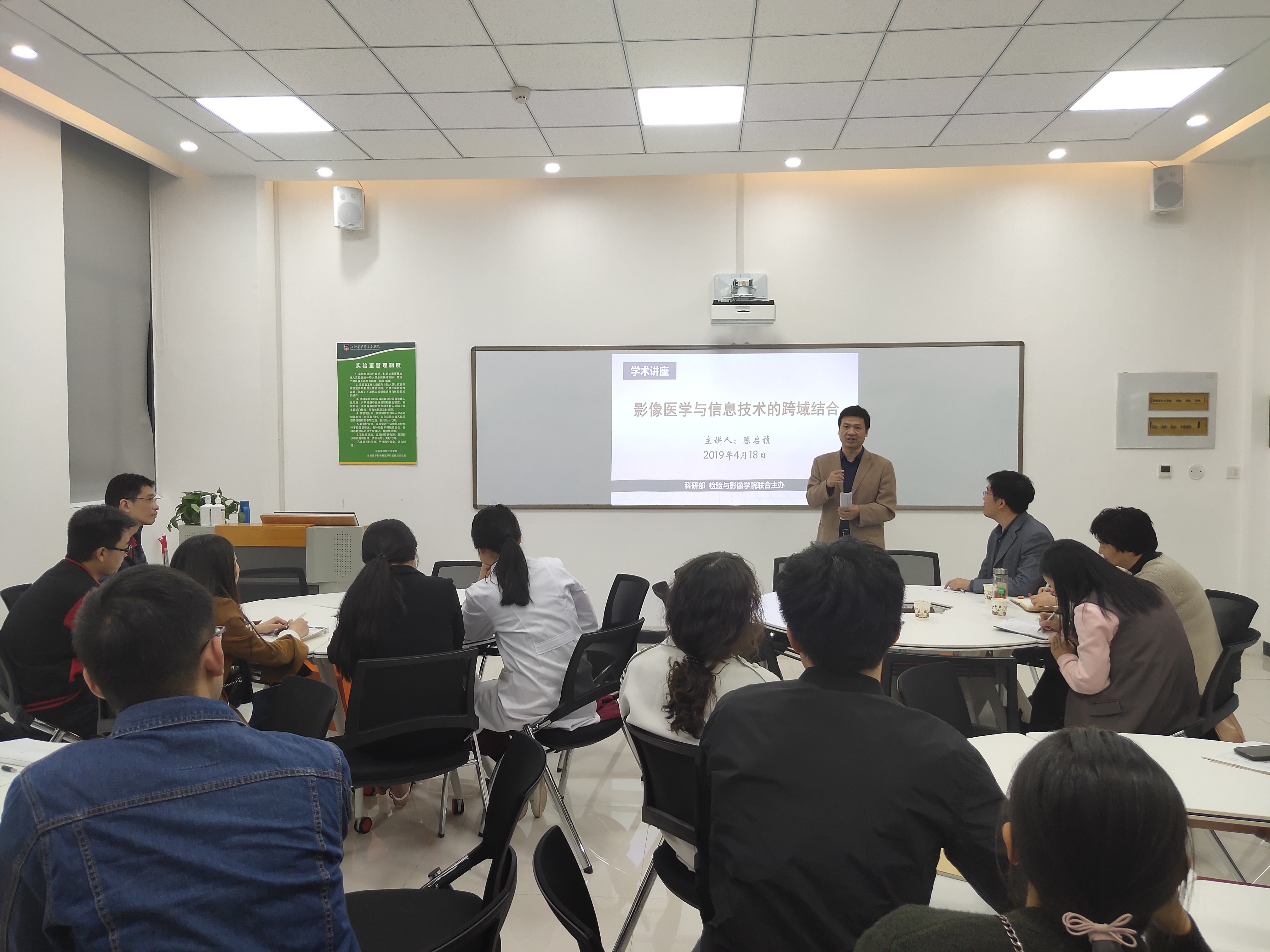 为提升教师的教育教学水平,加强科学研究能力, 4月18日中午,我院特邀台湾元培医事科技大学陈启祯博士在实训中心核磁实训室展开《影像医学与信息技术的跨域结合》学术讲座。学校副院长王彦杰出席,科研部张慧英主任、检验与影像学院全体无课教师共同聆听。讲座由检验与影像学院常务副院长胡淼主持会议。
