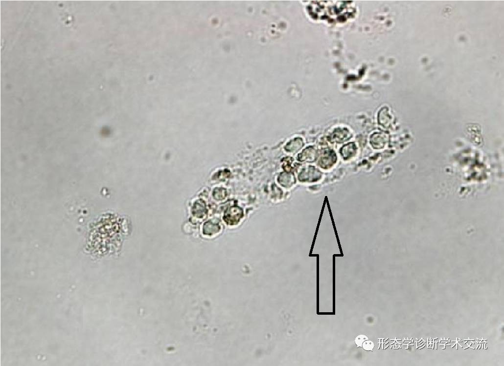 14、箭头所指细胞内结构的名称:上皮细胞管型 白细胞管型 混合细胞管型