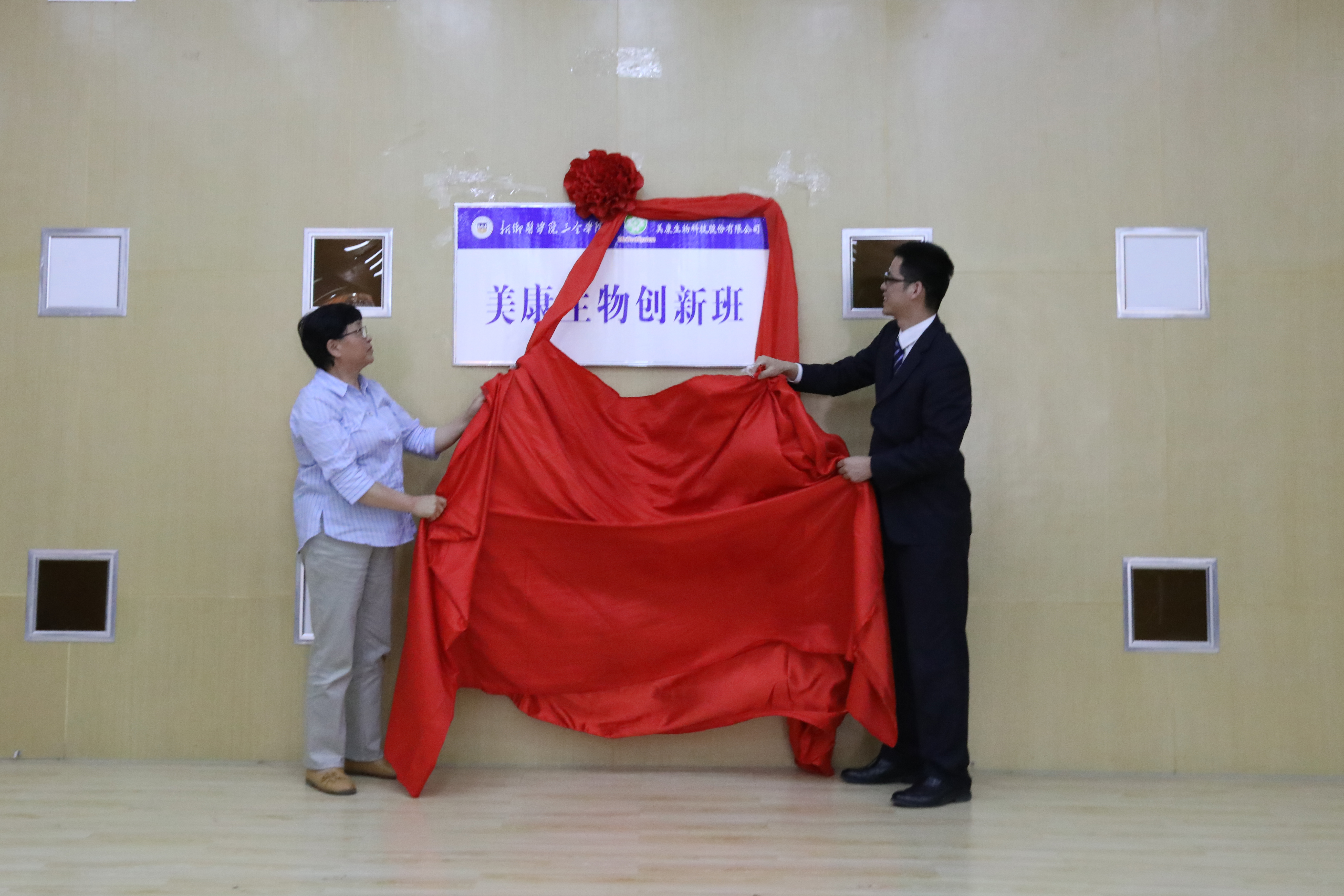 最后,在两百余名师生的见证下,杜华贞、吴立山为“美康生物创新班”班牌揭牌,开班仪式圆满结束。