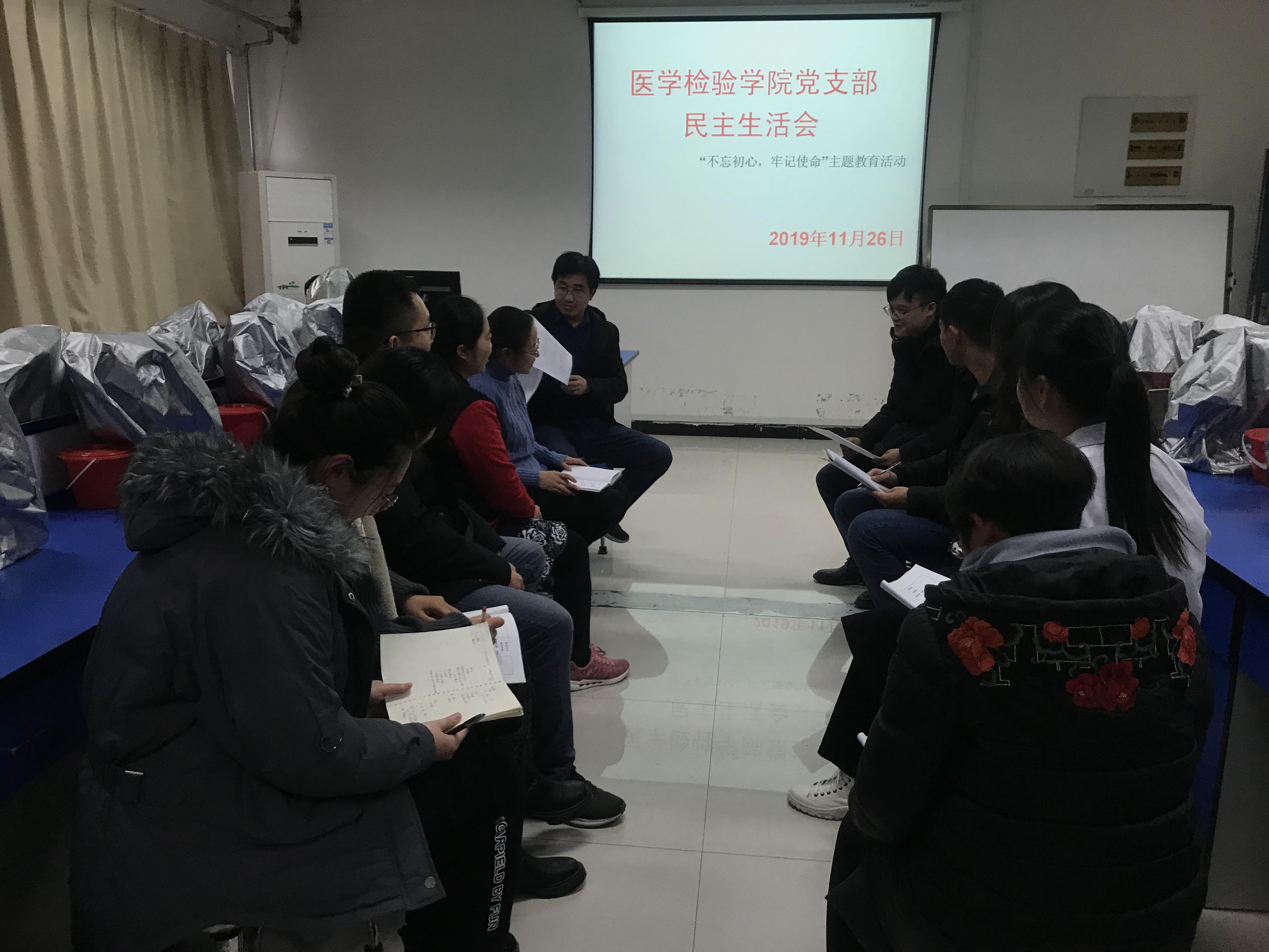 11月26日下午,医学检验学院党支部在院系楼四楼互三实验室召开“不忘初心 牢记使命”主题民主生活会,会议由党支部书记易东波主持,全体支部党员参加。