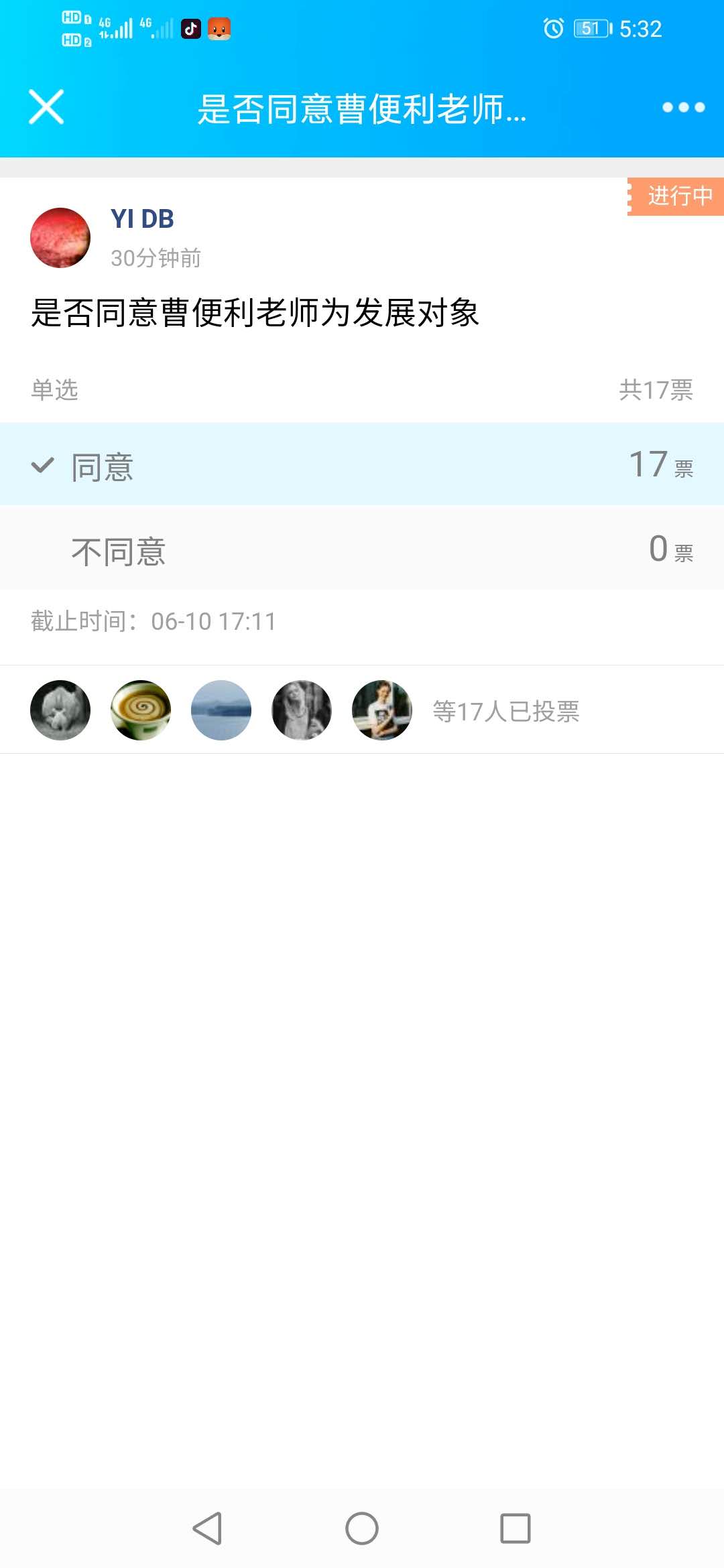 易东波:大家还有没有意见,如果没有,现在进行QQ线上投票方式。同意曹便利同志为发展对象的请投票。会议最后进行票数统计:支部正式党员17人,同意票数17票,全体党员一致同意曹便利同志为发展对象。