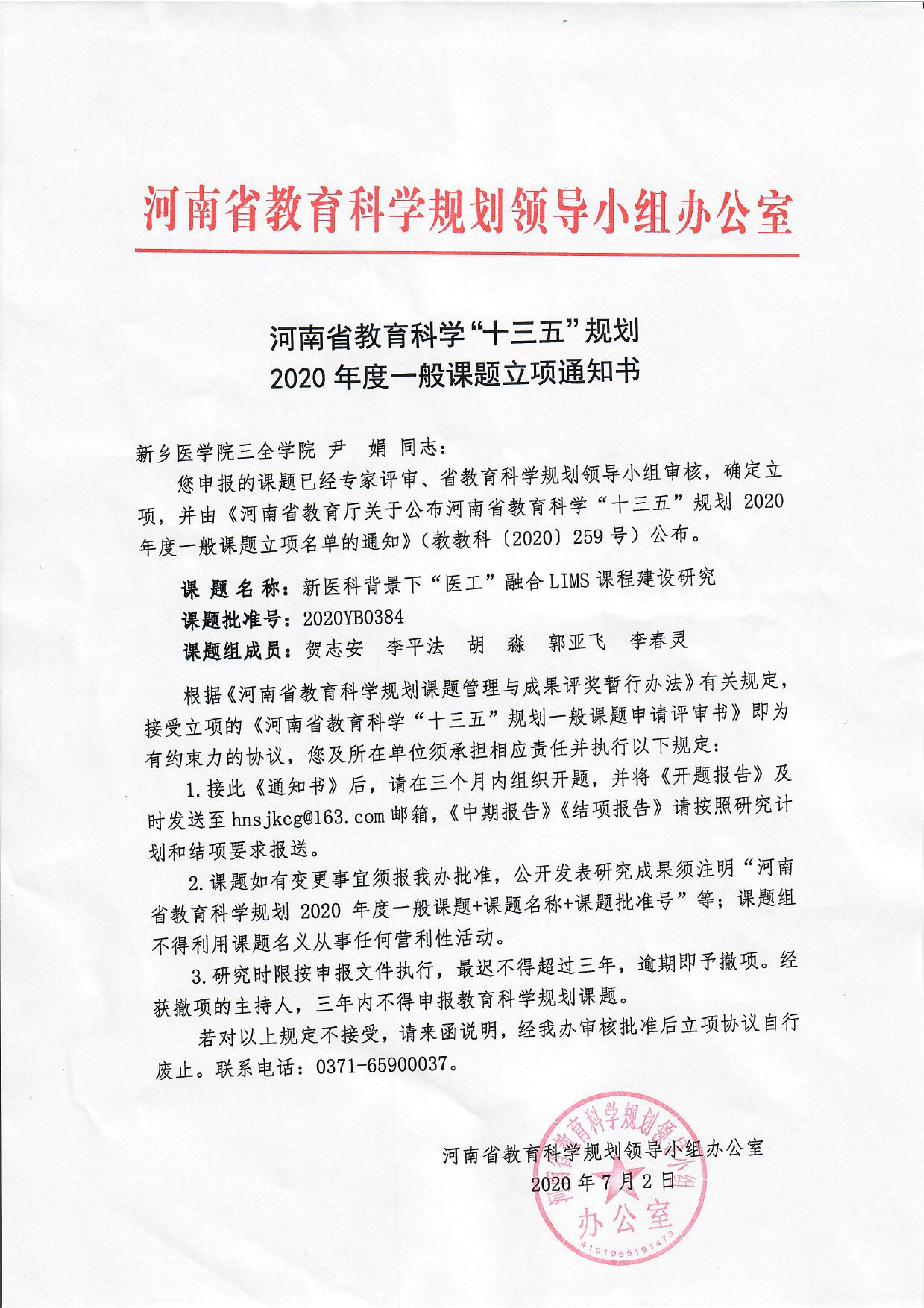 近日,河南省教育厅下发了《关于公布河南省教育科学“十三五”规划2020年度一般课题立项名单的通知》,我院尹娟老师的《新医科背景下“医工”融合LIMS课程建设研究》和李春灵老师的《校企合作应用型课程精准医学与组学检验研究》喜获立项。
