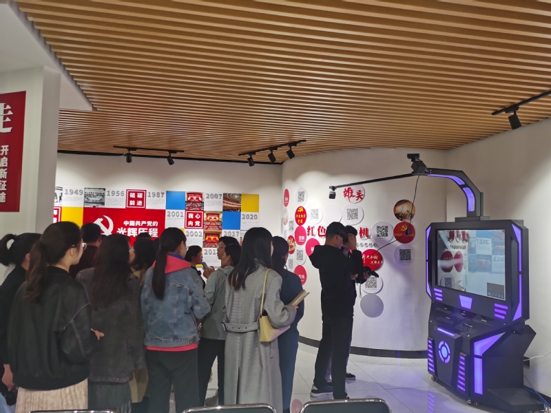现场观摩体验更是让党员教师大开眼界,头戴VR眼镜,视线前方就出现一个抗日战争展览馆,轻按手柄,一幅幅生动的浮雕、一件件珍贵的藏品跃然眼前。郭亚飞老师说:“真的就像在展览馆中走动一样,运用 VR技术来亲身体验抗日战争、解放战争、党的十一届三中全会、党的十九大、新冠肺炎疫情防控展览馆场景,效果非常好。”其他教师纷纷体验“身临其境”的奇妙,学习党史的热情无比高涨。