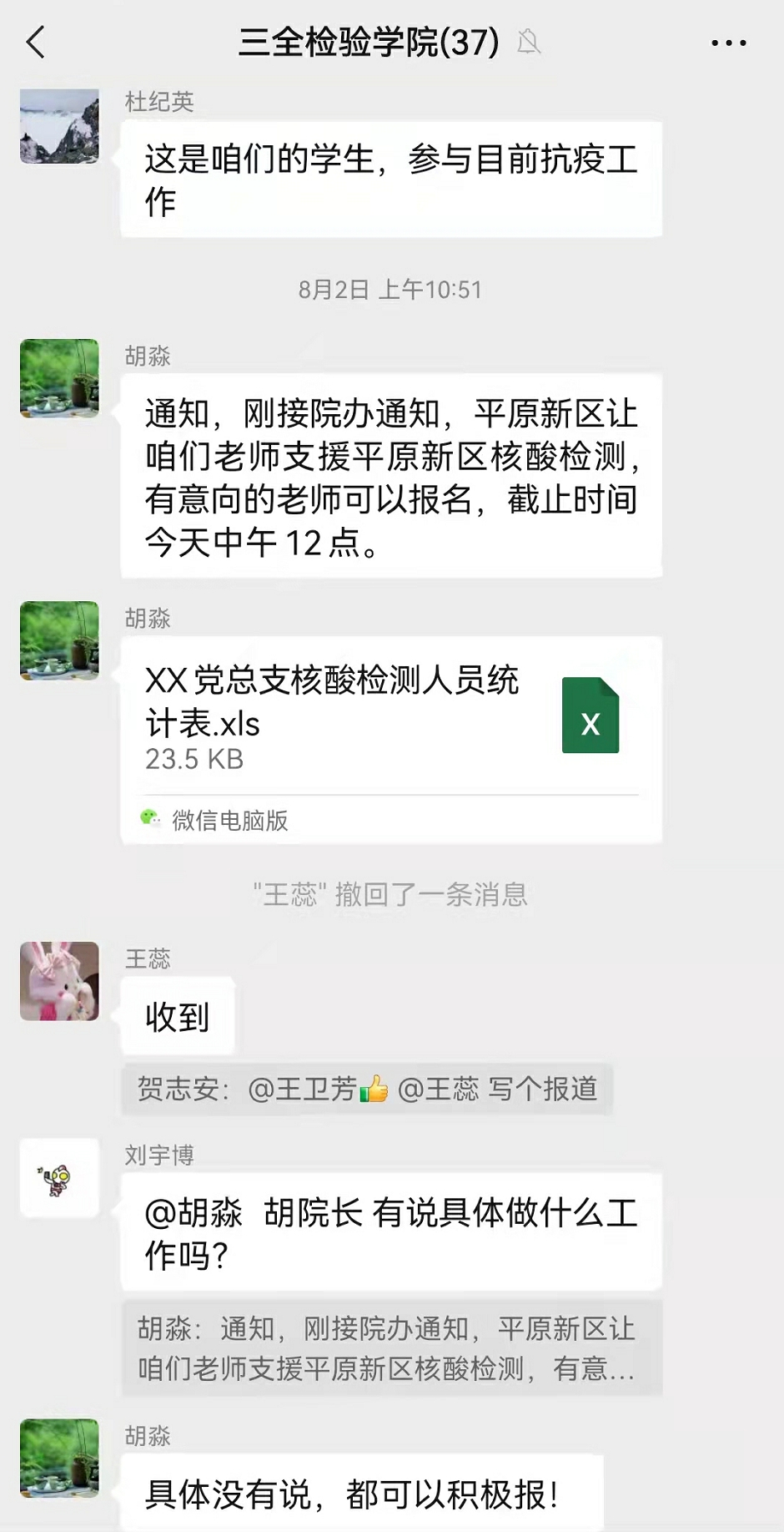 “通知:由于当前平原新区防疫抗疫工作任务较重,接院办通知,需要在我院征集6-10名志愿者,参与平原新区的核酸采样工作。”8月2日上午,医学检验学院常务院长胡淼在学院微信群里发布了一条紧急通知很快,报名接龙一个接一个,不出5分钟,一支10多人的志愿者队伍便已征集完毕。