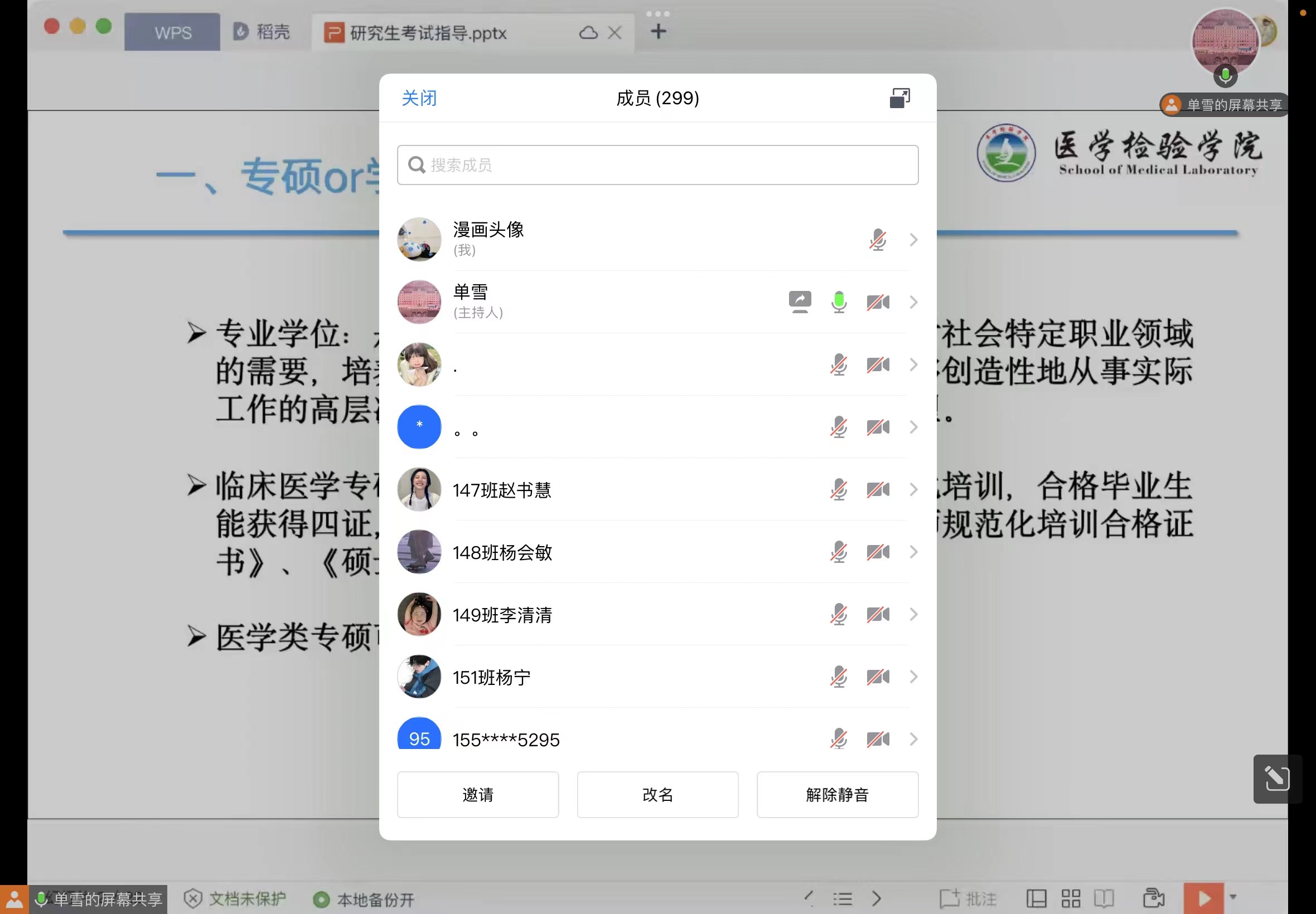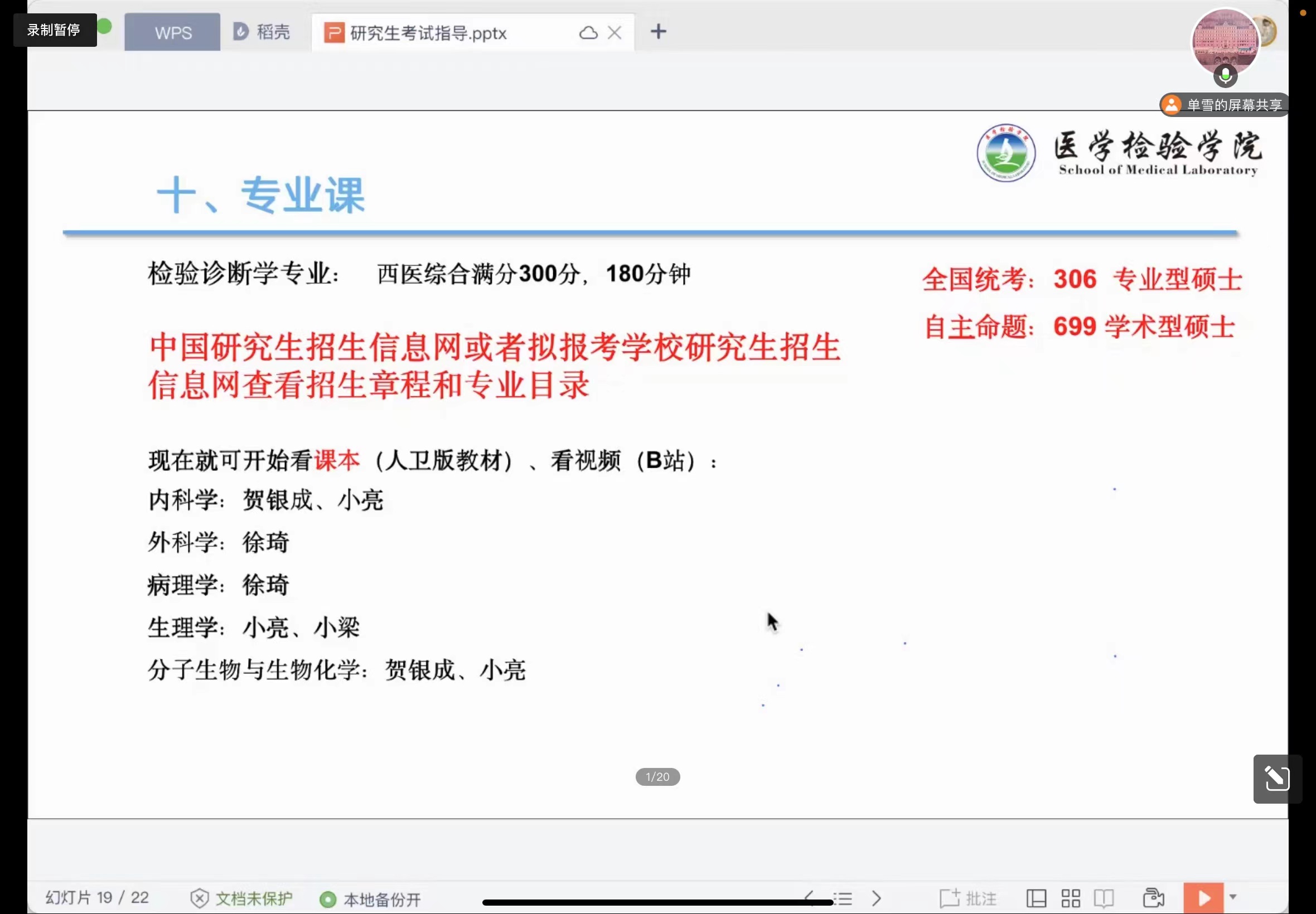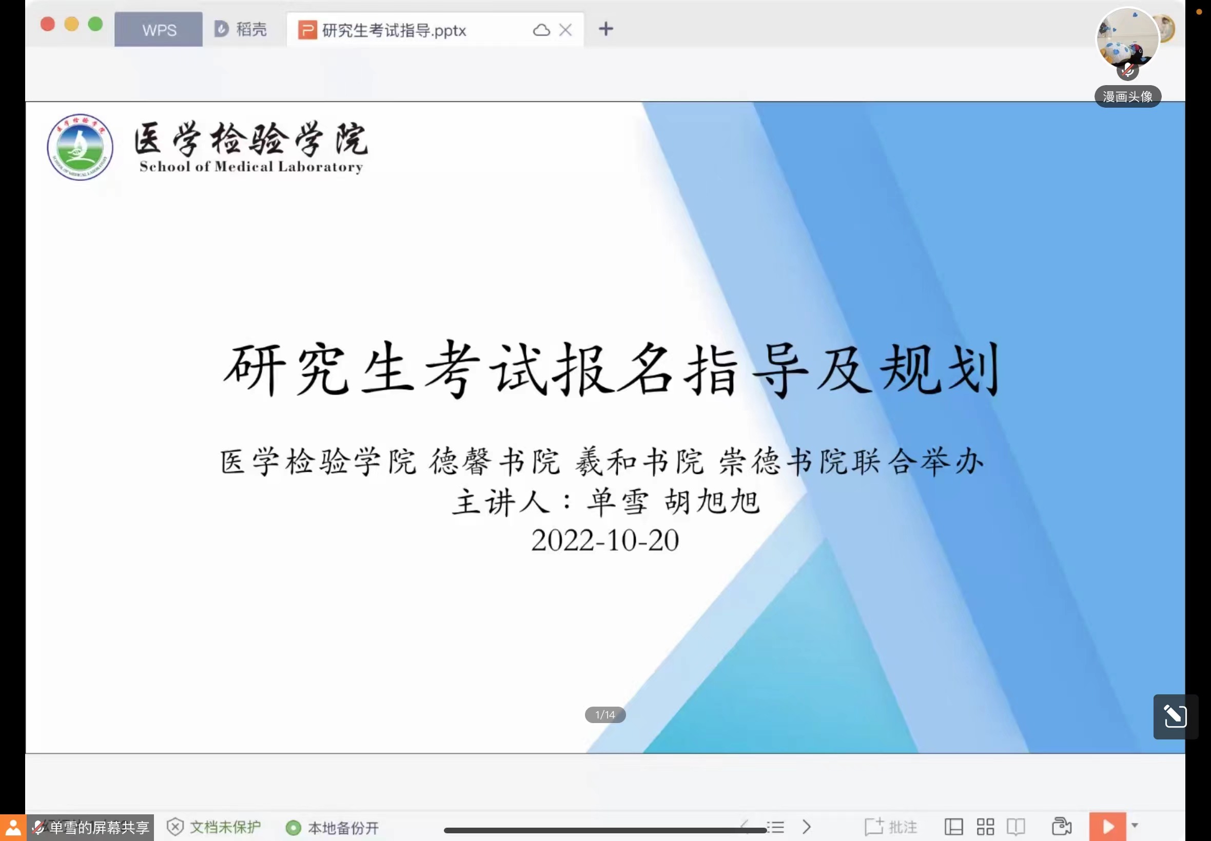考研如何择校?检验专业可以报考哪些方向?如何制定科学备考计划?医学检验学院根据医学检验技术专业学生的实际情况,帮助希望考研的同学积极应对考研,10月20日,学院联合德馨、羲和、崇德3家书院,在线上组织开展考研报名指导及备考规划专题讲座。优秀青年教师代表单雪、胡旭旭老师主讲,行政秘书李家磊老师主持,超过300名同学参加。