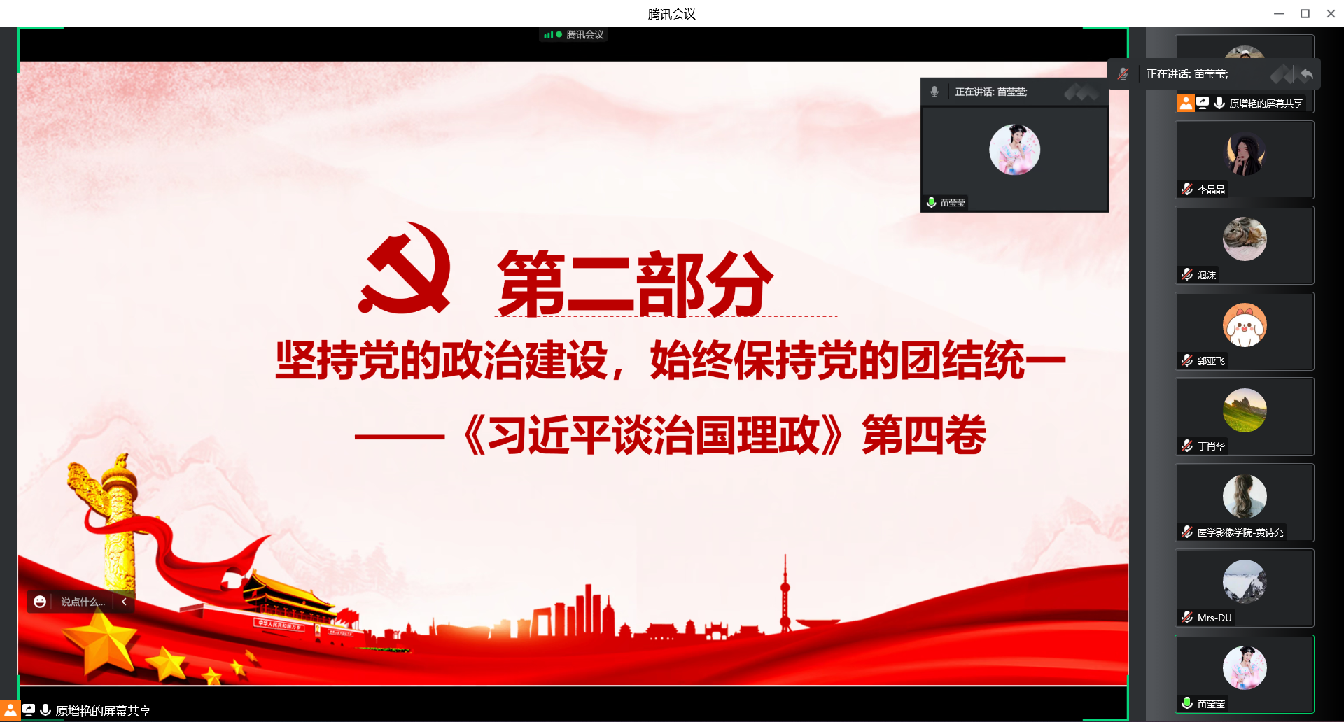 10月25日下午,检验与影像学院党总支中心组在腾讯会议进行10月份政治理论学习,会议由党总支书记苗莹莹主持,党总支理论学习中心组全体成员参加。