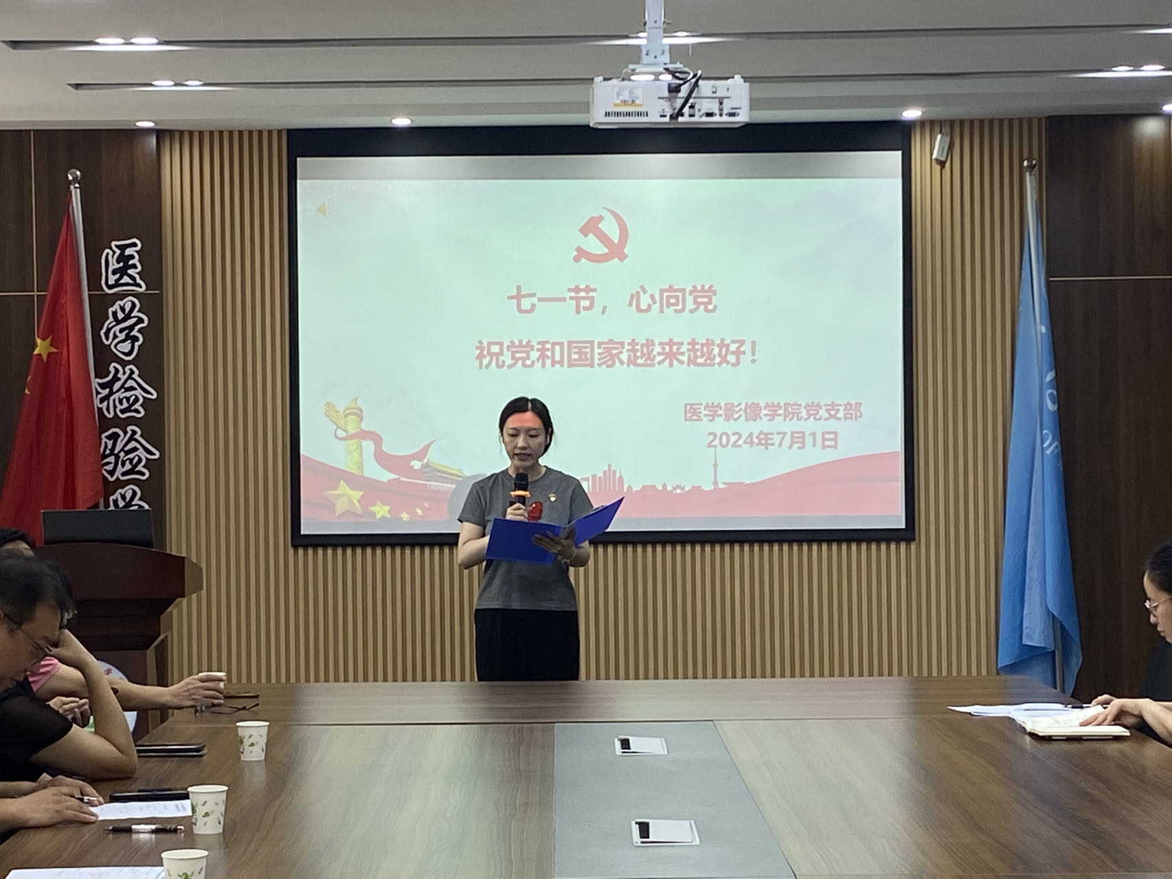 为庆祝中国共产党成立103周年,大力弘扬伟大建党精神。7月1日,新乡医学院三全学院检验与影像学院党总支在检验学院一楼会议室开展“庆七一·忆初心·强党性·促发展”系列党建活动。新乡医学院三全学院副院长薛宏、基础医学院党总支副书记王林翮、医学检验学院院长贺志安、医学检验学院副院长胡淼及医学检验和影像学院全体教师参加本次活动,检验与影像学院党总支副书记苗莹莹主持。