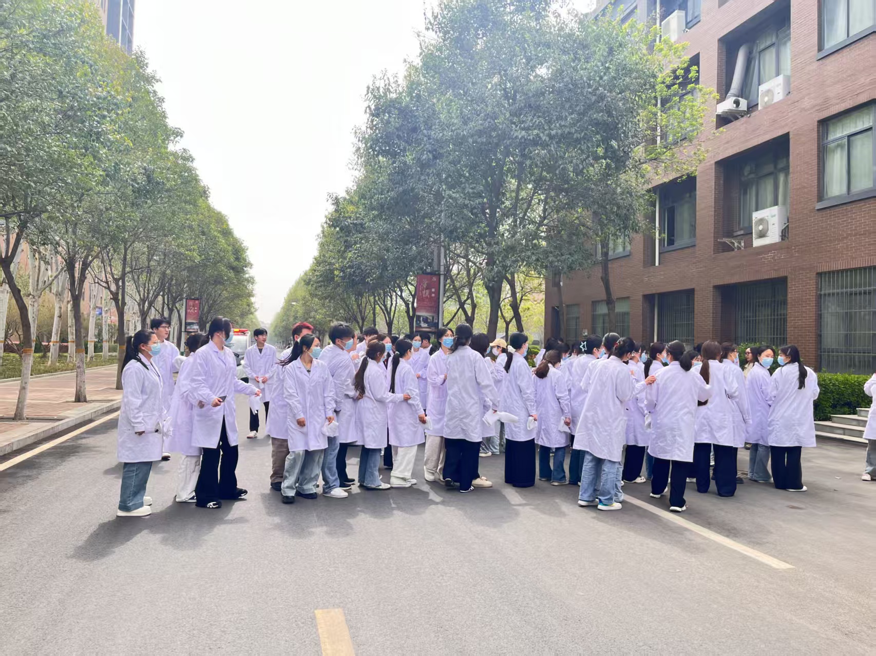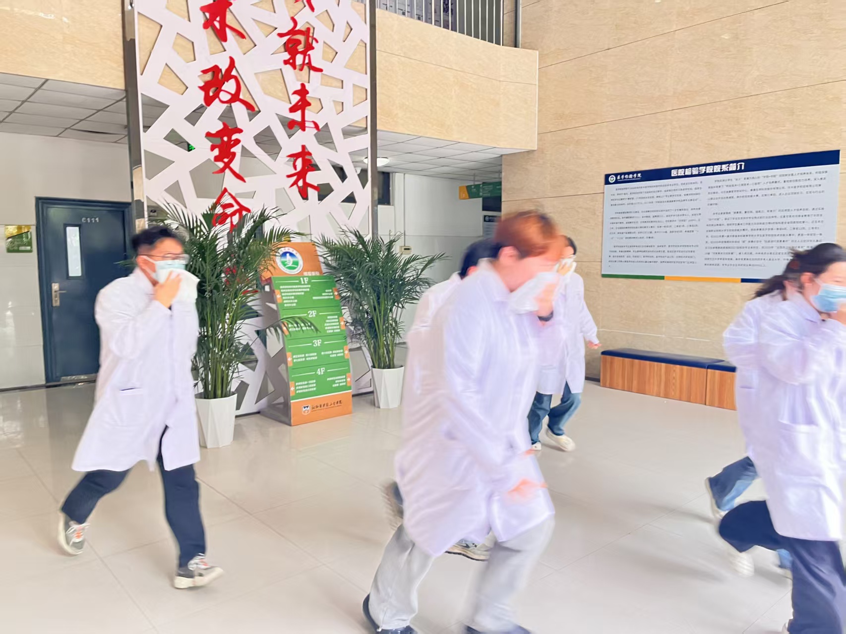 当日上午10时,随着一阵急促的警报声在校园内骤然响起,逃生疏散演练正式拉开帷幕。演练假设学院某教学楼突发火灾,火势迅速蔓延,浓烟滚滚。在发现“火情”后,学院老师迅速反应,立即组织学生疏散。同学们按照事先学习的逃生知识,保持冷静,用湿毛巾捂住口鼻,低姿弯腰,沿着预定的疏散路线,快速而有序地向安全区域撤离。在整个疏散过程中,保卫部工作人员坚守岗位,在各个关键位置进行引导和指挥,确保疏散过程安全、顺畅,避免出现拥挤、踩踏等事故。医学检验学院的老师们则积极协助,组织学生有序撤离,安抚学生情绪,提醒大家注意安全。