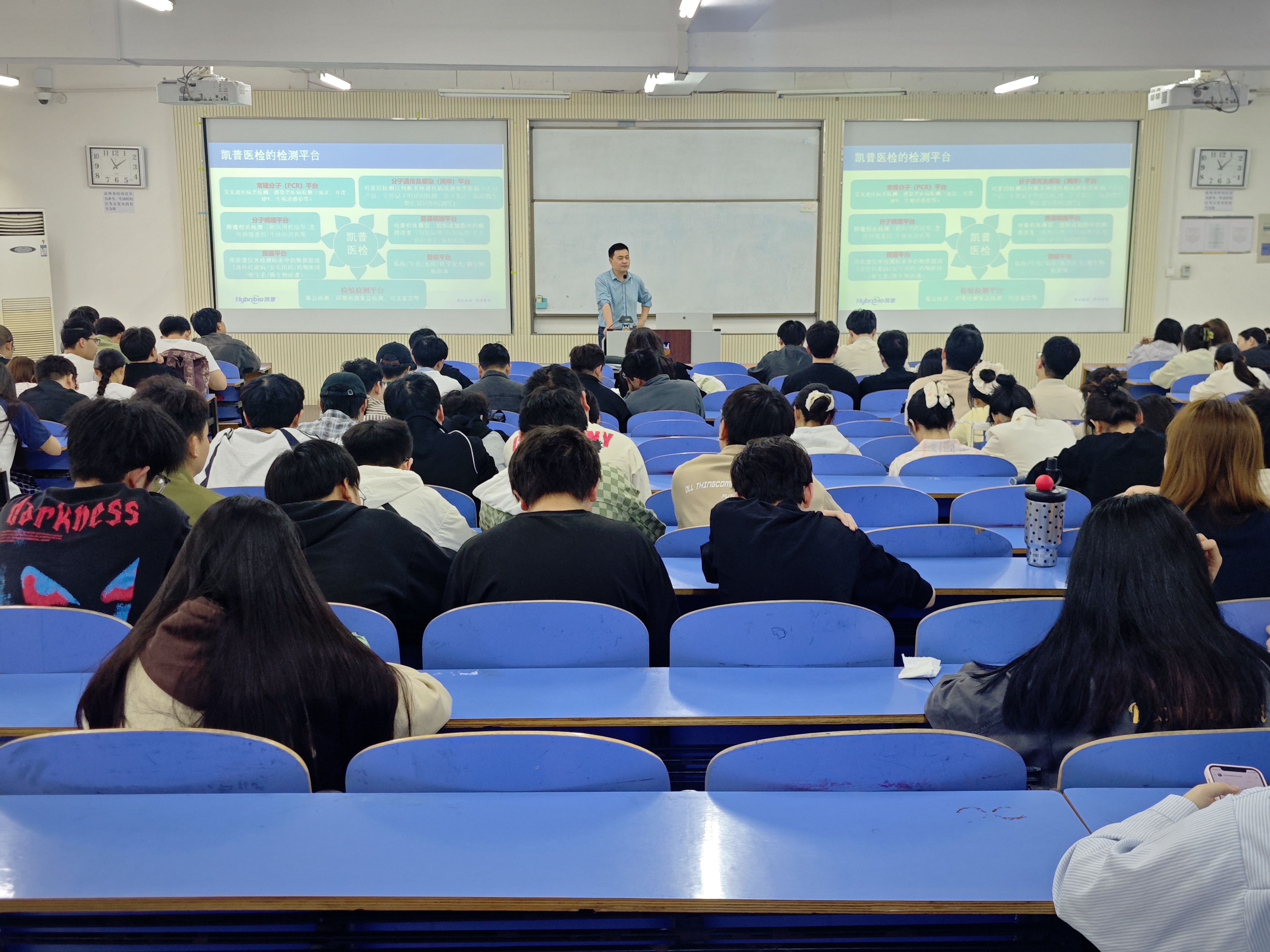 4月21日下午,医学检验学院与生命科学技术学院在谨学楼B102报告厅联合举办实习生招聘宣讲会,旨在搭建校企合作桥梁,为学生提供优质实习就业机会,助力毕业生职业发展。本次大会特邀广州凯普生物科技股份有限公司总经理屈群峰担任主讲嘉宾。两学院近300余名学生参与活动,现场座无虚席,气氛热烈,众多学生早早来到会场,期待能深入了解企业情况与实习岗位信息。