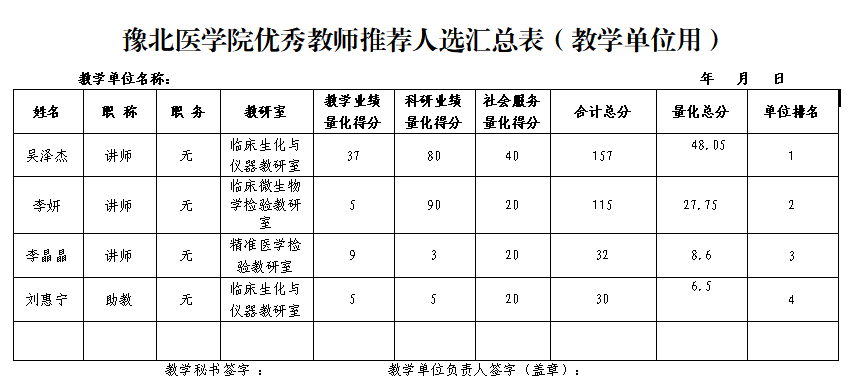 根据学校《关于开展2024-2025学年优秀教师、优秀实验技术人员评选工作的通知》,并按照《新乡医学院三全学院院(系、部)专业技术人员工作量管理办法》,经评选领导小组公平、公正的整理核算工作量并进行折合后,结果公式如下。如有异议,请于两日内向评选工作领导小组反馈。医学检验学院2024-2025学年优秀教师材料.zip