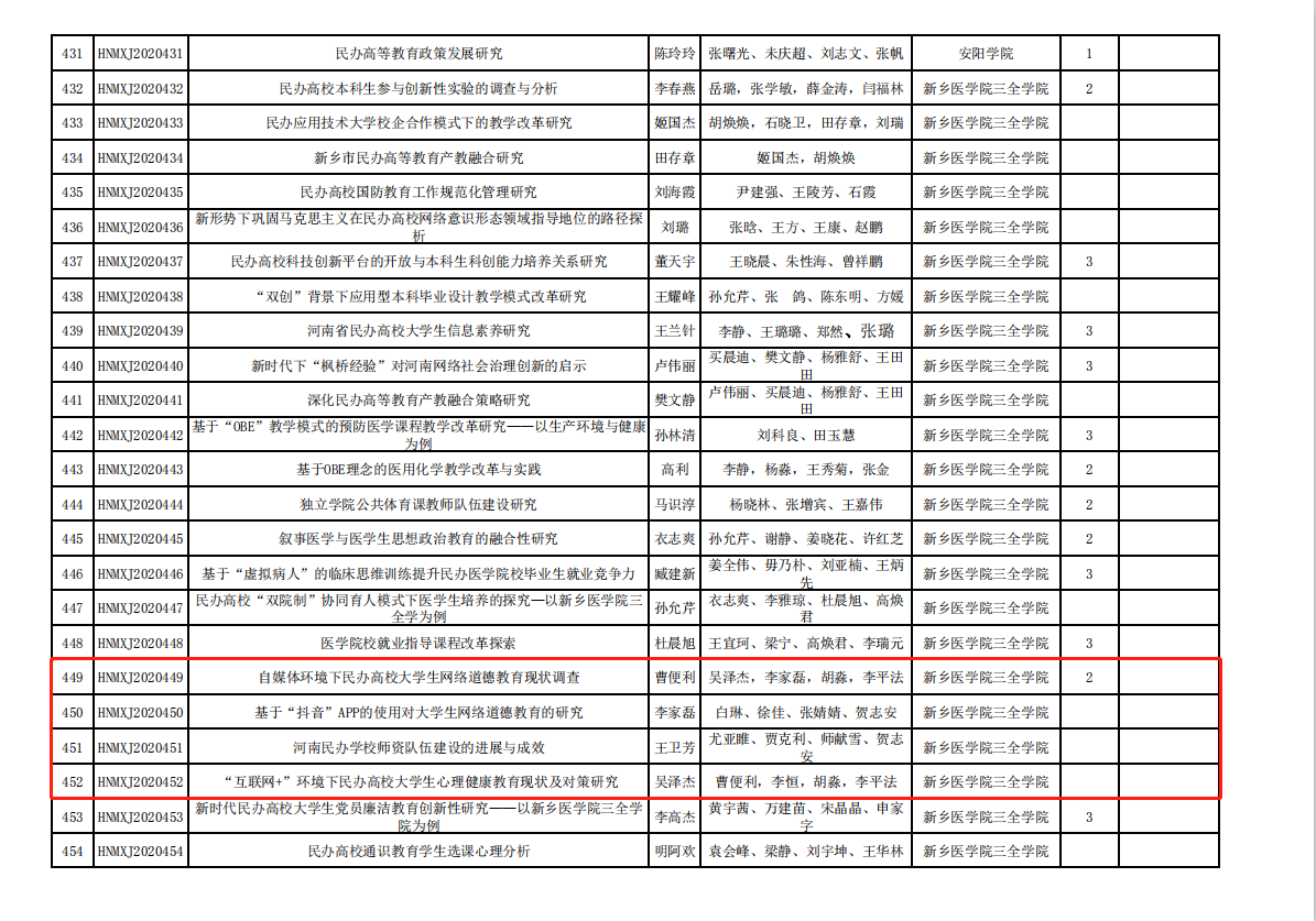 日前,2020年河南省民办教育协会研究课题结项工作完成,我院曹便利老师主持的项目“自媒体环境下民办高校大学生网络道德教育现状调查(HNMXJ2020449)”成功结项,并被评为优秀项目二等奖。同时,李家磊、...